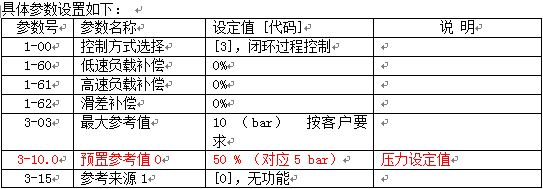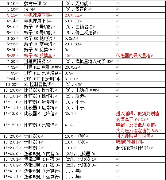 通過以上設(shè)置,當(dāng)恒壓系統(tǒng)中泵的轉(zhuǎn)速低于20.1 Hz時,延時10秒,啟動休眠模式,變頻器停止輸出;在泵處在休眠狀態(tài)時,當(dāng)恒壓供水系統(tǒng)的壓力反饋值低于4 bar時,延時10秒,啟動變頻器,這樣就實現(xiàn)了恒壓供水系統(tǒng)的休眠功能。