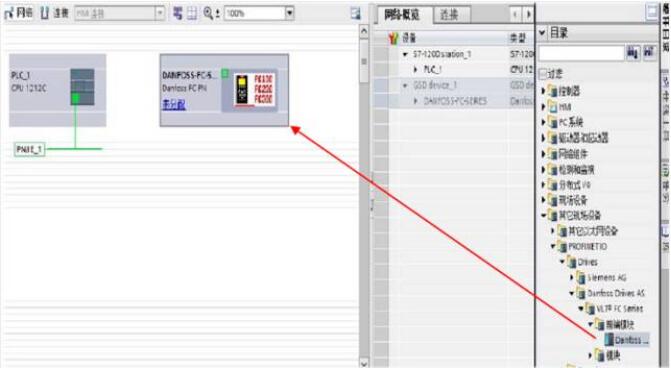 七、:配置丹佛斯變頻器(進入‘網絡視圖’-打開右側‘硬件目錄’-選擇‘Danfoss Drives AS-前端模塊’-‘Danfoss-FC-SERIES’),如圖七所示: