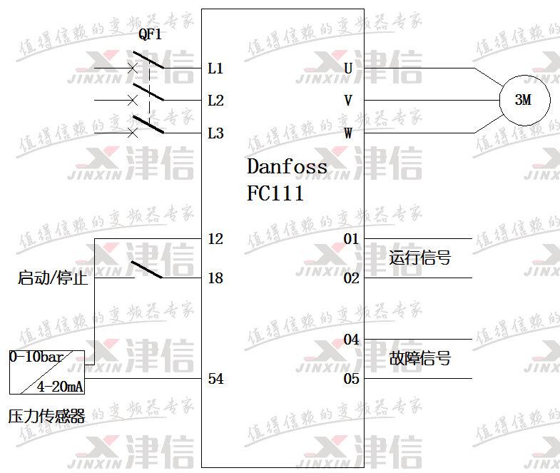 三、FC111單泵恒壓控制接線(xiàn)示意圖如下: