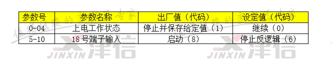 2.外部12 ,18號端子接起??刂崎_關(guān)。 3. 通過面板按下面的參數(shù)分別在0號菜單設(shè)置上電工作狀態(tài),5號菜單設(shè)置18號端子輸入值。