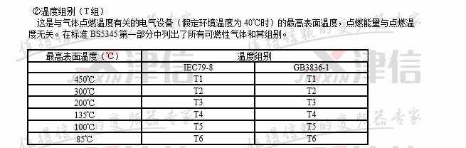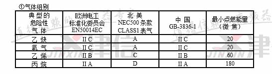 注:中國GB3836標(biāo)準(zhǔn)規(guī)定ⅡC級最小點(diǎn)燃能量為19微焦耳,ⅡA級最小點(diǎn)燃能量為200微焦耳。氣體分組和點(diǎn)燃溫度,在一定環(huán)境溫度和壓力下與可燃性氣體和空氣的混合濃度有關(guān)。