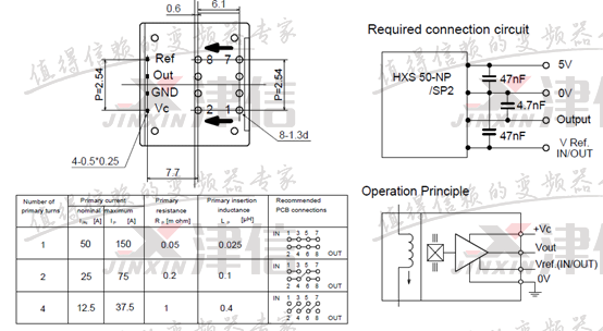 3、測(cè)量三相輸出電流檢測(cè)電路,查看電流傳感器型號(hào)為HXS 50-NP,測(cè)量輸入電源只有2.4V,而HXS 50-NP正常工作的輸入電源為5V。可以確定故障點(diǎn)在此。接線圖如下:
