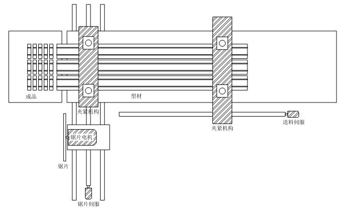 1.夾緊機構:機械中包含兩個夾緊機構用于夾緊型材,一個負責在鋸切的時候防止型材移位,另一個由送料伺服帶動,用于帶動型材完成型材進給。