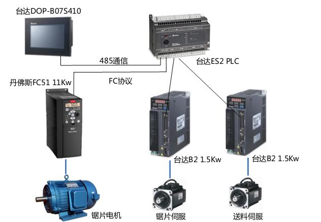 臺達ES2 PLC自帶兩組高速脈沖用于控制伺服,最高頻率到達100KHz,同時滿足了精度和速度的要求。ES2 PLC帶有兩組RS485通信口,分別與DOP-B07S410觸摸屏和FC51變頻器通信。