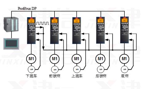 驅動系統的整體結構如圖四,每根軸獨立按自己的電子凸輪曲線運行,屬于典型的分布式控制系統,對主控制器的性能要求,一般的PLC就能勝任。由于每根軸都與主軸保持電子凸輪同步關系,所以總體上可以實現多軸同步的控制需求。其中下跑車運動控制器比較特殊,他具有虛擬主軸脈沖輸出的功能,代替主控制器發送主軸脈沖信號。