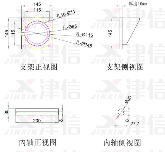 安裝OGD需要按現場條件準備輔助支架和轉動軸,這些附件的機械尺寸如下圖: